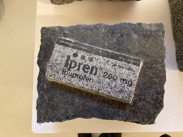 I et detaljeret, realistisk formsprog skildrer Laila Westergaard hverdagsting i den hårde granit, men der sker noget med vores oplevelse af det velkendte, som for eksempel en iPhone, en ostemad eller en pakke ipren, når de hugges i granit.